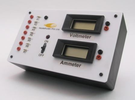 The load measurement box has a built-in voltmeter and ammeter for measuring the voltage and current produced by the fuel cell. Students will learn to read the markings on a resistor to know its resistance. The seven resistors on the load measurement box are used to plot the characteristics curves of the fuel cell.